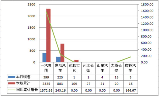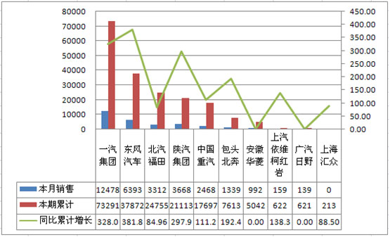 2018年1-3月,货车产销分别完成95.5万辆和98.5万辆,产销量同比分别增长4%和4.3%。其中,东风汽车销售货车12.5万辆,排名第一,增幅为6.9%;销量前十五名中,上汽大通企业销量增幅最大为8061.4%。