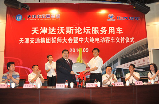 9月4日,在一片喜庆祥和的气氛中,2010年天津夏季达沃斯论坛服务用车·天津交通集团誓师大会暨中大纯电动客车交车仪式在天津隆重举行。中大集团董事长徐连国,总裁助理袁瑞兵,中大汽车中威公司副总经理蔡江州以及天津交通集团董事长、总经理武岱,党委书记靳和连,副总经理王福荣等出席。