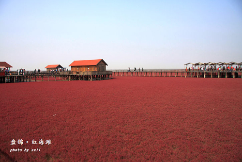 秋天不只是有着绚丽色彩的枫叶,盘锦红海滩的奇景令人神往。所谓红海滩,是指长在盘锦海边滩涂的一种碱蓬草丛,到了秋天就变成一种很艳丽的紫红色。站在风景区岸边向大海中望过去,一片很鲜艳的红色滩涂在蓝天碧海之间格外抢眼。