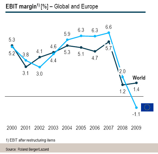 全球供应商的EBIT利润率(息税前利润率)在2008和2009年降至十年来的低点,分别为1.2%和1.4%,而欧洲的供应商的EBIT利润率在2009年更降至-1.1%。(参见图1)