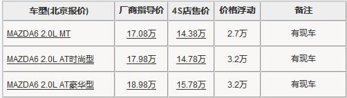 据北京地区一汽马自达店内的销售人员表示,马自达6自动挡车型全系优惠3.万元,自动挡车型优惠后的最低售价为可观的14.78万。店内现车较充足,颜色主要有黑、红、灰色可供选择。而马自达6的超豪华车型已经停产,马自达的手动车优惠2.7万元,到店详谈会得到更满意的优惠。预定其他颜色车型交定金1千元需等15天消费者便可以提车。北京地区各4S店由于订单不同,各店销售的现车颜色有所不同。