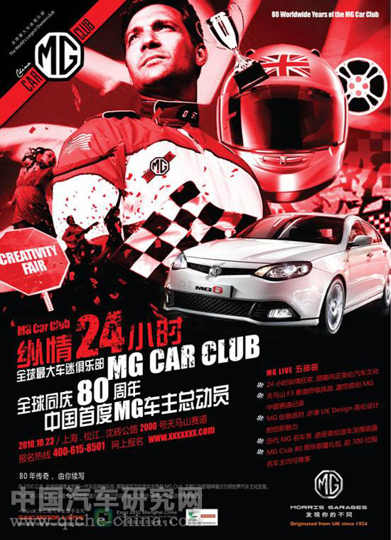 此番MG Club China盛大登陆中国,也将与全球MG爱好者同庆MG俱乐部成立80周年。同时推出了“纵情24小时”MG LIVE五部曲活动系列,在这一盛会中,MG Club China将带您领略到纯正英伦汽车文化;欣赏到MG历代名车,感受英伦造车的深厚底蕴;创意派对,让您尽享UK Design英伦设计的创新魅力,此外,天马山F3赛道中级挑战赛也将倾力推出,邀您首创MG中国赛道记录,前300位报名车主更可以领取到MG Club 80周年限量礼包!