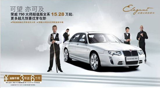 荣威750除了沿袭了荣威品牌车型一贯的高品质以外,秉承荣威和斯诺克经典、尊贵、内蕴的品牌精神,在保留“优雅公商务”特性之余,也融入风潮、时尚的元素。借黄金周购车热潮与“金融助购”的冰点价格,相信荣威750在国内汽车市场中会有不俗的表现。