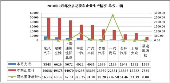 2010年9月多功能车生产42086辆,累计生产319383辆,销售40335辆,累计销售314478辆,同比累计增长分别为92.22%和88.62%。