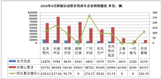 2010年9月两驱运动型多用途车生产74108辆,累计生产532836辆,销售70692辆,累计销售526388辆,同比累计增长分别为160.35%和157.64%。