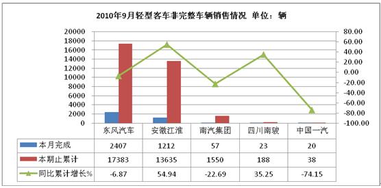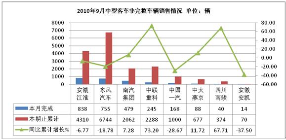 2010年9月客车非完整车辆生产7324辆,累计生产62847辆,销售7278辆,累计销62243辆,同比累计增长分别为7.06%和6.29%。