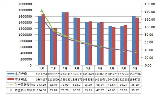 由上图可以看出,1-9月份汽车产销量以及增长幅度均保持一致。2月份销量较1月份有较大幅度回落,3月份销量激增。进入第二季度后销量开始逐月回落,但是从8月开始又回升态势。