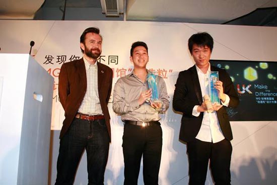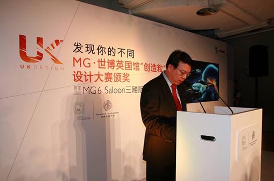 和MG6 Saloon揭幕仪式同时进行的,是历时三个月风靡中国草根创意人群的MG“创造粒”设计大赛的颁奖仪式。由两名年轻中国设计师设计的作品——“神奇的呼吸”和“驿站”,有幸摘得最终大奖。在此次活动中,上汽集团还特地为此次与英国馆的合作精心打造了 “MG6 Fastback Limited”(世博英国馆限量版MG6),留下了永久的创意结晶。该车汲取了英国馆的创意灵感,融合最为新潮的设计元素,通过大胆运用内饰色彩的反差搭配,呈现出UK Design个性的格调,为那些热衷炫耀英伦气质的客户,带来难得一遇的英伦汽车设计收藏品。最重要的的是,当英国馆在世博会结束拆除之后“MG6 Fastback Limited”将是英国馆留下的“唯一永恒的和值得纪念的礼物”。