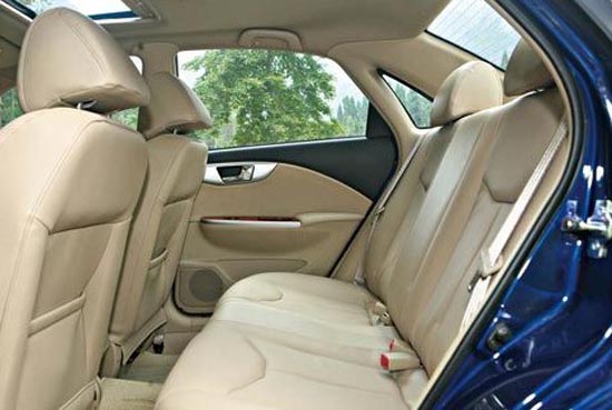 空间方面,悦动的轴距同样惊人,和荣威350一样长达2650mm,从而保证了舒适的乘坐空间。宽敞的后排空间也更加适合全家人乘坐。身高为178cm的男士坐在前排调整好驾驶姿势,头部距车顶尚有两拳的距离,空间很充裕。转到后排受到车顶造型的影响,头部空间比较局促,仅有三指,但是腿距前排靠背有两拳的距离,表现非常出色。