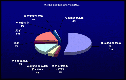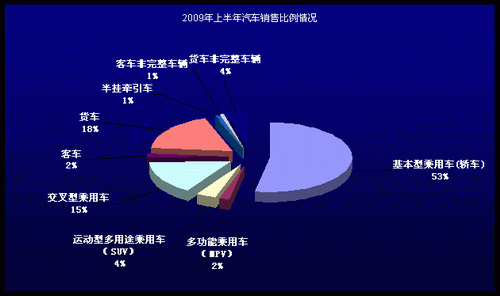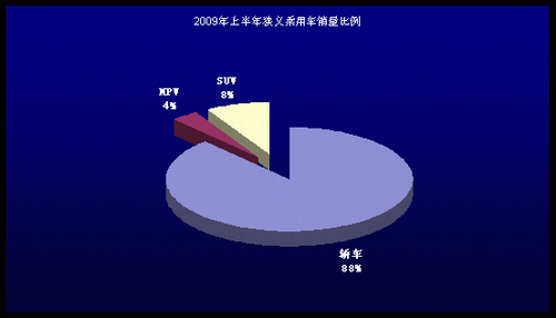 2009年上半年我国共生产狭义乘用车3475922辆,其中轿车生产3108055辆,MPV生产100385辆,SUV生产266768辆。狭义乘用车销售3591048辆,其中轿车销售3207783辆,占狭义乘用车总销量的88%,MPV销售101947辆,占狭义乘用车总销量的4%;SUV销售281665辆,占狭义乘用车总销量的8%。