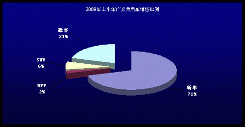 2009年上半年我国广义乘用车共销售4524998辆,其中轿车销售3207783辆,广义乘用车销量的71%;SUV销售281665辆,占广义乘用车销量的6%;MPV销售101947辆,占广义乘用车销量的2%;微客销售933603辆,占广义乘用车销量的21%。