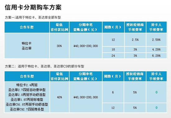 从表格中可以看到,除一些信用卡必要的手续费率之外,无其他费用,而4-20万元的分期额度也满足了消费者购买的需求,特别要指出的是,如图所示的几款单独罗列的车型,最低首付比例不能低于40%,而持卡人手续费率方面也得到了全免的优惠,真真正正给到消费者最大的实惠。但是同时由于地区差异,有关详情请同各地区专营店咨询了解详细情况。还有一点需要说明的是,分期付款购买华泰圣达菲的信用卡包括民生白金信用卡、金卡、普卡以及符合华泰汽车分期额度授信政策的汽车分期业务无卡交易客户。