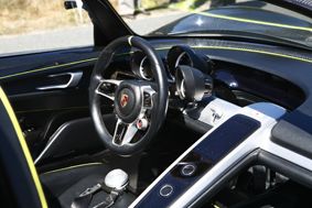 同样不会出现在量产车上的还包括后视镜摄像头、梦幻般的中控台,以及有些古怪的尾翼。中置发动机的进气口是否会自动升降也未做定论。当然,真正的量产版918 Spyder 不会是敞篷车,MichaelMauer 会给它一顶得体的“帽子”。相比之下,我极度喜欢侧置的排气管、超薄的座椅以及与方向盘固定在一起的仪表组合,希望它们不会在量产车上“夭折”。