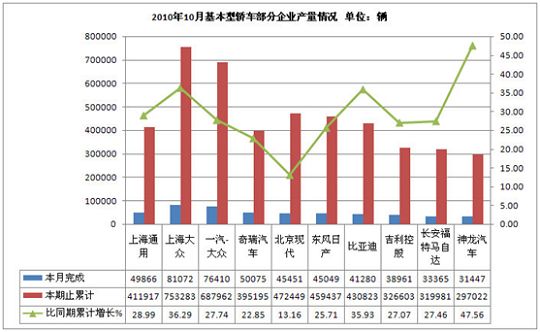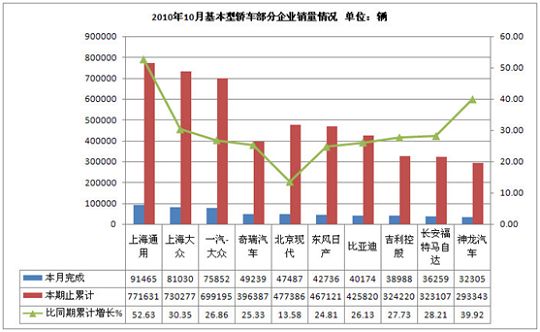 2010年10月基本型轿车生产829523辆,累计生产7628747辆,销售835199辆,累计销售7639608辆,同比累计增长分别为30.69%和29.62%。