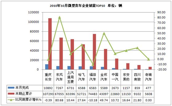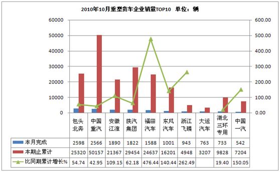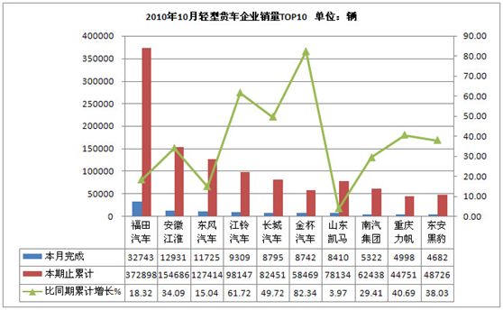 2010年10月货车生产226321辆,累计生产2316989辆,销售225518辆,累计销售2340638辆,同比累计增长分别为22.59 %和26.18 %。