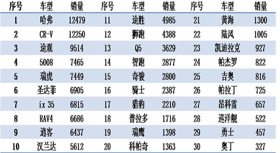 10月,SUV市场销量虽然出现小幅下滑,但整体形式和格局基本保持稳定,哈弗SUV、CR-V、途观等老面孔依然占据着销售排名前列,哈弗SUV超越CR-V,以12479辆的成绩再次夺得月度销售冠军,途观继续保持了旺盛的销量态势,9514的销量保证了其在SUV细分市场的第一阵营。