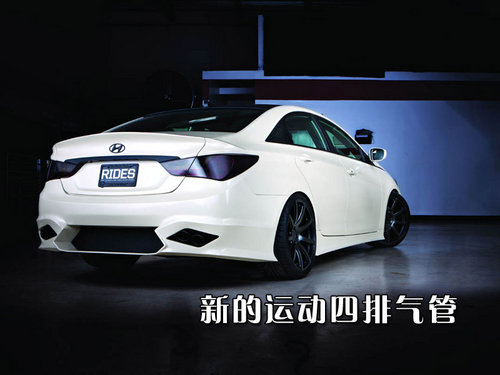车身后部在视觉上比前脸更具冲击力,尾灯同样做了外观熏黑处理。SEMA版索纳塔使用了新的运动排气系统,四排气管被安装在了后包围两侧的菱形洞口内。后部镶嵌有深蓝色碳纤维贴片。