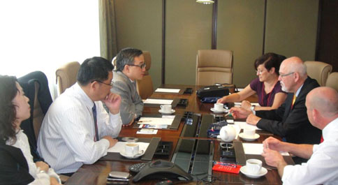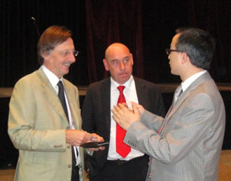 VNU亚洲展览集团仲刚(右)与UITP 总裁Alain Flaush (左) 和BAAV总秘书长 Patrick Van Impe (中)商讨有关合作。