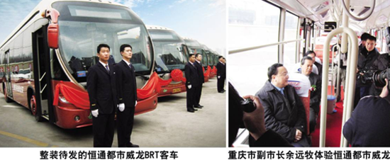 早在2008年1月,重庆第一条快速公交(BRT)示范线——高九路示范线竣工通车,这在重庆公交发展史上具有里程碑式意义。而服务这条BRT线路的客车就是恒通都市•威龙客车。时任重庆市副市长余远牧、重庆市公交集团董事长杨茂超等领导及来自各大媒体、近千市民共同见证了都市•威龙开始BTR线路运营的重要时刻。