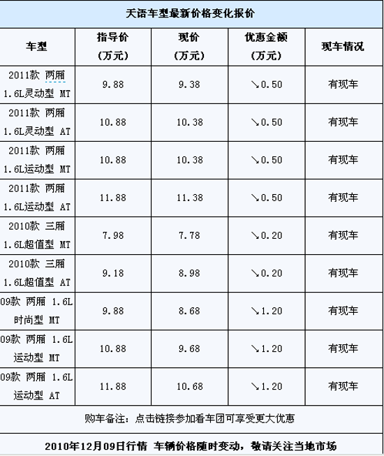 近日,汽车之家编辑从济南大成汽车销售有限公司了解到,目前2011款天语 SX4有现车供应,购车可享5000元现金优惠,同时三厢公务版更是直降10000元,而老款车型优惠幅度更大,达到了1.2万元。感兴趣的朋友可报名参加汽车之家组织的看车团活动,现场享受更大优惠。详情请见下表: