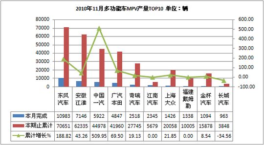 2010年11月多功能车生产42307辆,累计生产400298辆,销售42115辆,累计销售396316辆,同比累计增长分别为83.29%和82.09%。