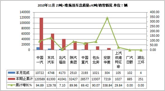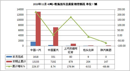 2010年11月半挂牵引车生产30693辆,累计生产336069辆,销售28277辆,累计销售334121辆。