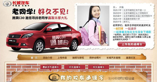 “忆往昔、看今朝,重温那既遥远又亲切的同窗情趣;通缉你、找到我,追寻那既清晰而又模糊的莽撞少年。” 据活动规则介绍,只要在人人网注册的用户均可参加此次“老同学,好久不见”活动。参与者用户只需点击“上传我的通缉令”或者“上传作品”,填写详细的个人求学信息和图片作品,保存生成“我的通缉令”,系统将依据学校自动生成同学会照片墙,就有机会赢取长城汽车腾翼C30“老同学,好久不见”万元聚会基金及更多精彩大礼。