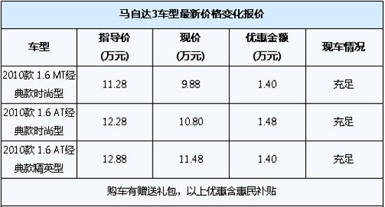近日从长安马自达沈阳中联处了解到,目前购买马自达3 1.6L车型最高可优惠1.48万元,并有礼包赠送,店内现车比较充足,详情请见下表: