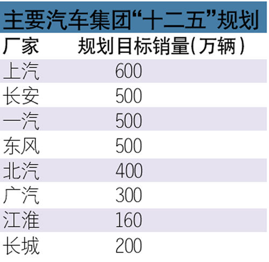 本报讯(记者 王灿彬)在2010年年末和2011年初的时候,国内最主要的汽车六大汽车集团陆续公布到“十二五”末各自的规划目标。“领头羊”上汽为600万辆,遥遥领先于其他三大集团。产能增长最迅速的长安汽车也提升至500万辆;而一汽公布2015年目标:500万辆,其中200万辆为自主品牌;“四小”集团之一的广汽近两年扩张迅猛,在刚结束的广州车展上公布了其2015年:300万辆,尽管其2010年的销量还不到100万辆。