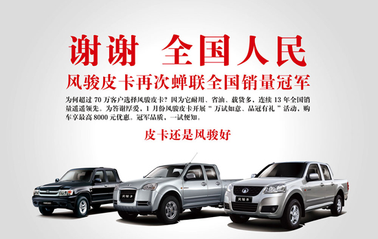 70万用户的信赖,使得风骏皮卡连续13年夺得销量冠军。风骏皮卡感谢70万用户中的每一位用户的支持,感谢您长达13年的支持,您的信赖是我们前进的最大动力。风骏皮卡,感谢一路有你!