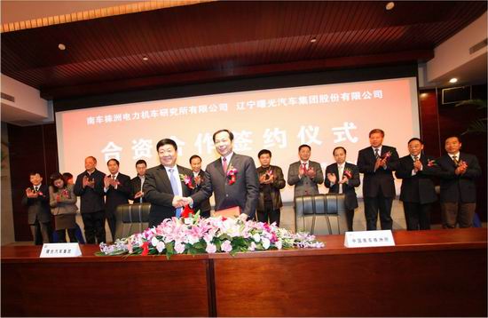 1月6日,我国最大的新能源汽车电传统系统供应商和最早的客车制造商走到一起。在多位国家部委、地方政府官员和众多媒体记者的共同见证下,南车株洲电力机车研究所有限公司(以下简称“南车株洲所”)与辽宁曙光汽车集团股份有限公司在北京正式签订合资合作协议,共同打造新能源客车航母,做国内最大的新能源客车产业化研发和制造基地。其中,南车株洲所隶属于我国央企电动车产业联盟16个发起企业中的中国南车股份有限公司(以下简称“中国南车”),曙光汽车集团则是国内公交客车市场领先企业丹东黄海汽车有限责任公司的母公司。