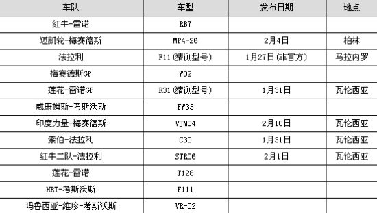 新车方面,只有5支车队对外确认了发布时间。分别是:迈凯轮,莲花-雷诺,印度力量,索伯和红牛二队。法拉利,之前只模糊的表示F11(猜测型号)会在1月份的最后一周和公众见面,但具体是哪天并没有讲。目前的小道消息报道可能在1月27号。