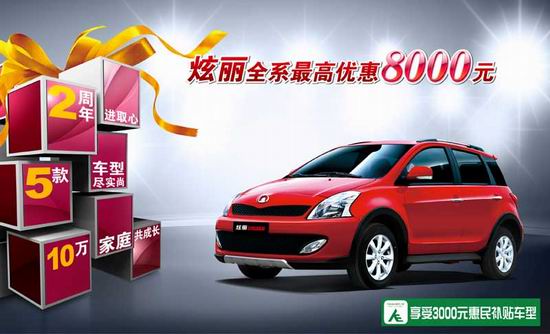 今年6月底,国家公布首批“节能产品惠民工程”中,炫丽AMT全系入选首批车型,成为5万余元自动挡的代表车型。9月底,炫丽全系10余款车型入选,消费者在购买时均可获得每辆3000元的节能红包,创造了自主品牌单一车型入选最多的记录。