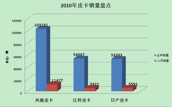 最新销售数据统计显示,2010年12月风骏皮卡单月销量达1.15万辆,相当于第二、三名销量的总和,继2010年3月破万以来,风骏皮卡单月销量再次轻松破万,继续领跑皮卡市场的同时,再创皮卡行业销量新高。同时,风骏皮卡也以10.32万辆的全年总销量,连续13年获得皮卡销量冠军,王者地位不容撼动。