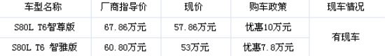 今日从上海世贸沃尔沃4S店获悉,现正值12周年店庆,沃尔沃S80L T6智尊版降价10万元,S80L T6智雅版优惠7.8万。除现金优惠之外还可享多种金融贷款组合方案,25%的最低首付不到14万即可成为车主。详情请参见下表: