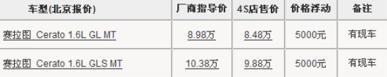 东风悦达起亚对赛拉图欧风、赛拉图两款车型的官方指导价进行了调整,分别下调了3000元和4000元,这无疑进一步加大了赛拉图及赛拉图欧风的市场竞争力。近期,编辑从东风悦达起亚北京经销商处了解到,赛拉图仅优惠5000元,手动车型有部分现车。详情请见下表:
