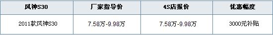 近日,编辑从东风风神沈阳经销处了解到,现在购买2011款风神S30,就可以享受3000元的让利,另外还有购车礼包相送,并且现在店内现车充足。具体优惠行情明细如下: