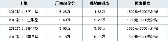 近日,辑从北京奇瑞4S店了解到,新款风云2享国家补贴3000元,另外除河北地区外再优惠1500元现金,河北境内特推出异地代办上险服务,优惠1000元,部分车型有现车,具体价格详情如下: