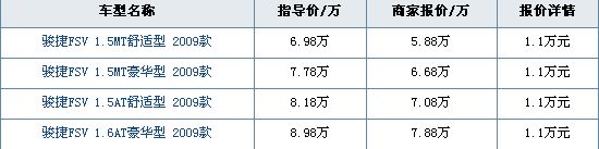 日前,编辑从二级经销商了解到,目前2009款骏捷FSV有大量现车,并且四款车型都优惠1.1万元,除了现金优惠以外,还赠送万元礼包,礼包中,贴膜、真皮座椅和GPS等可以任意搭配选择。具体优惠明细如下: