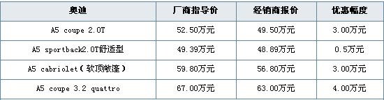 编辑从广州地区奥迪经销商处了解到,奥迪A5系列各车型购车均有优惠,其中3.2FSI车型最高优惠可达4万元,感兴趣的网友可咨询广州地区奥迪经销商。