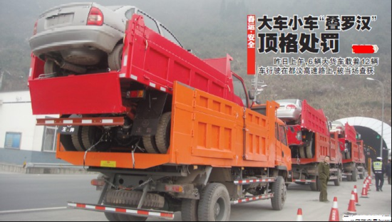 大货车上装着小货车,小货车上装着小轿车,就如同马戏团里叠罗汉一样。昨日上午11点左右,6辆大货车总共载着12辆车子就这样行驶在都汶高速路上,被交警当场查获。而这6名司机也收到了顶格罚单。