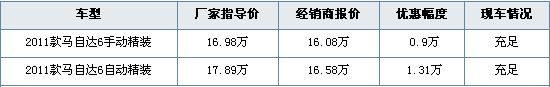 近日,编辑从沈阳中联马自达4S店获悉,借春节促销的大气候,2011款马自达6精装版优惠万元。2011款马自达6的动感时尚外形,吸引了很多朋友的青睐,值此新春佳节之际,更是推出重大优惠措施。具体情况见下表: