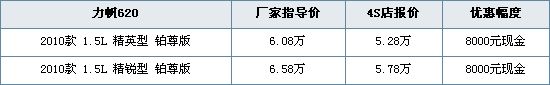近日编辑从南昌力帆4S店处了解到,即日起,到该店购买力帆620,可享受店里推出3000元节能补贴,5000元力帆集团上市优惠的活动,总共优惠现金8000元。喜欢的朋友可以到店里详细了解,具体降价明细如下表: