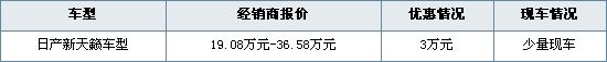 近日编辑从东风日产东风南方通惠专营店了解到,目前店内举办“年末感恩回馈活动”,即日起至大年三十,凡购买天籁贺岁版车型,即可享受3万元现金优惠。目前店内现车不多,具体明细请见下表: