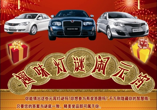 农历正月十五,是中国传统的元宵佳节,新春期间的节日活动也将在这一天达到一个高潮。按中国民间的传统,在一元复始,大地回春的节日夜晚,天上明月高悬,地上彩灯万盏,人们观灯、猜灯谜、吃元宵,合家团聚、其乐融融!在这个样一个喜庆的节日里,吉鑫荣威为广大车友们准备了颇具民俗风格的节日活动——“猜灯谜 品好车 闹元宵”活动。