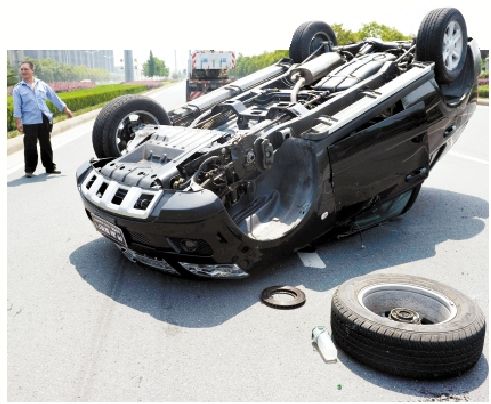 记者核实:在浙师大门口的二环北路上,一辆崭新的黄海SUV仰面朝天躺在路中央,车子右前轮滚落一旁。百米开外,拖车正准备将一辆别克轿车拉走。别克车受损较轻,但前保险杠和一侧大灯也脱落了。
