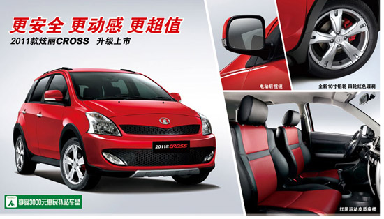 随着购车消费群体年轻化的趋势,A0级车型市场的竞争日趋白热化,消费者对于A0级车的要求也开始变得挑剔和严苛,安全则被当成“头等大事”来考虑。对此,集多重主、被动安全措施于一身的炫丽CROSS再度升级,推出2011款炫丽CROSS,用更加安全并且更为环保的姿态,诠释跨界小车的新风尚,更以6万元的亲民价格成为精品小车的标杆。