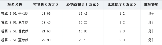 价格波动情况:凭借着时尚动感的外观,充沛的动力,睿翼赢得了不少消费者的喜爱。睿翼在沈阳地区的现金优惠一直都有,但是高达2.8万元的优惠是从未有过的。