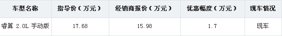 价格波动情况:凭借着时尚动感的外观,充沛的动力,睿翼赢得了不少消费者的喜爱。睿翼在沈阳地区的现金优惠一直都有,但是低配车型高达1.7万元的优惠是从未有过的。