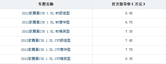 特别注释:2012款腾翼C30如选装GPS+MP5,将在原车价上增加2500元;海南、云南、西藏、新疆四省区将加收500元/台运费。